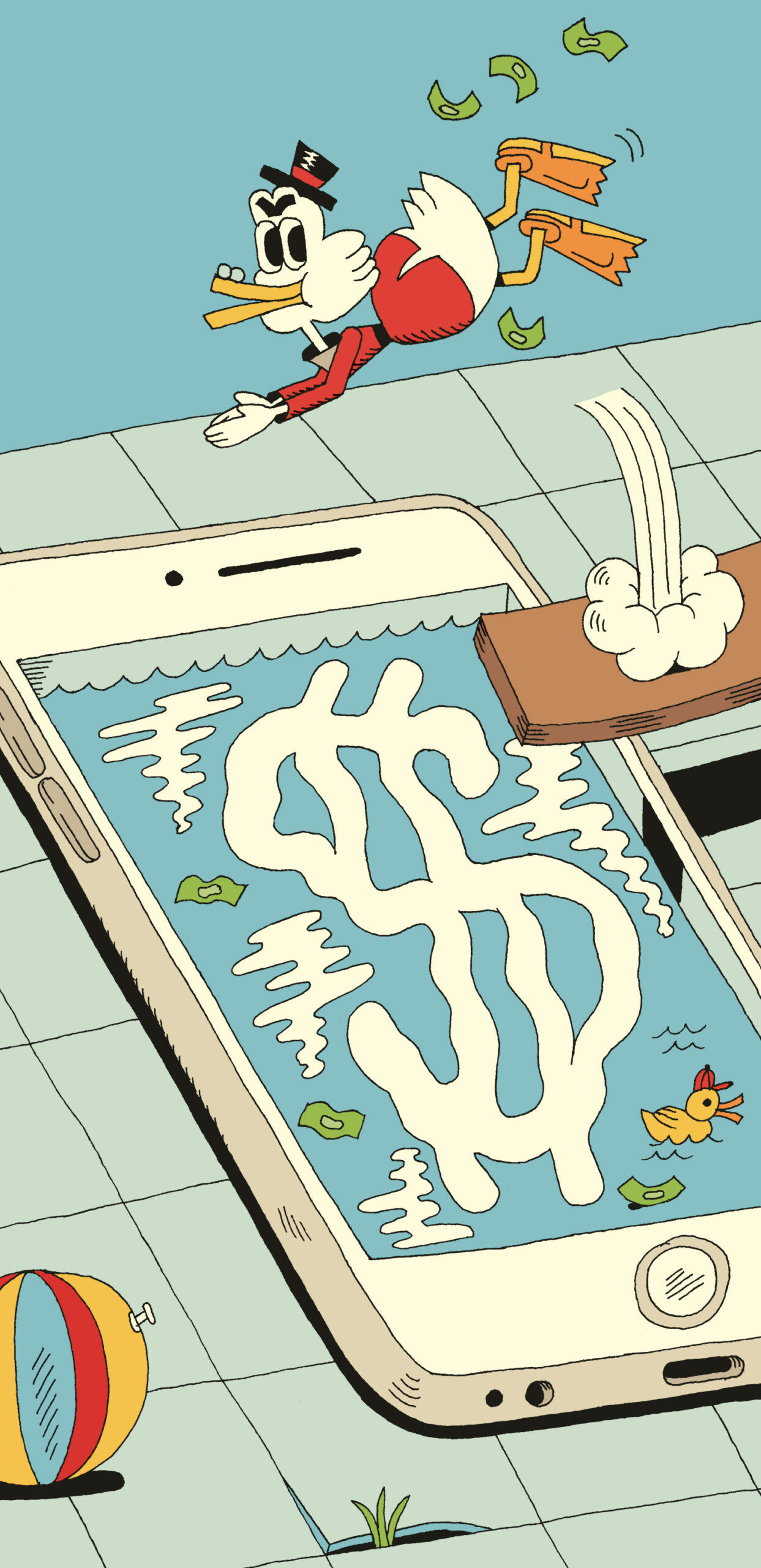 Illustrations de la couverture et de l’ouverture du dossier principal du magazine Welcome to the jungle nº7, sur le thème de la « fintech ».